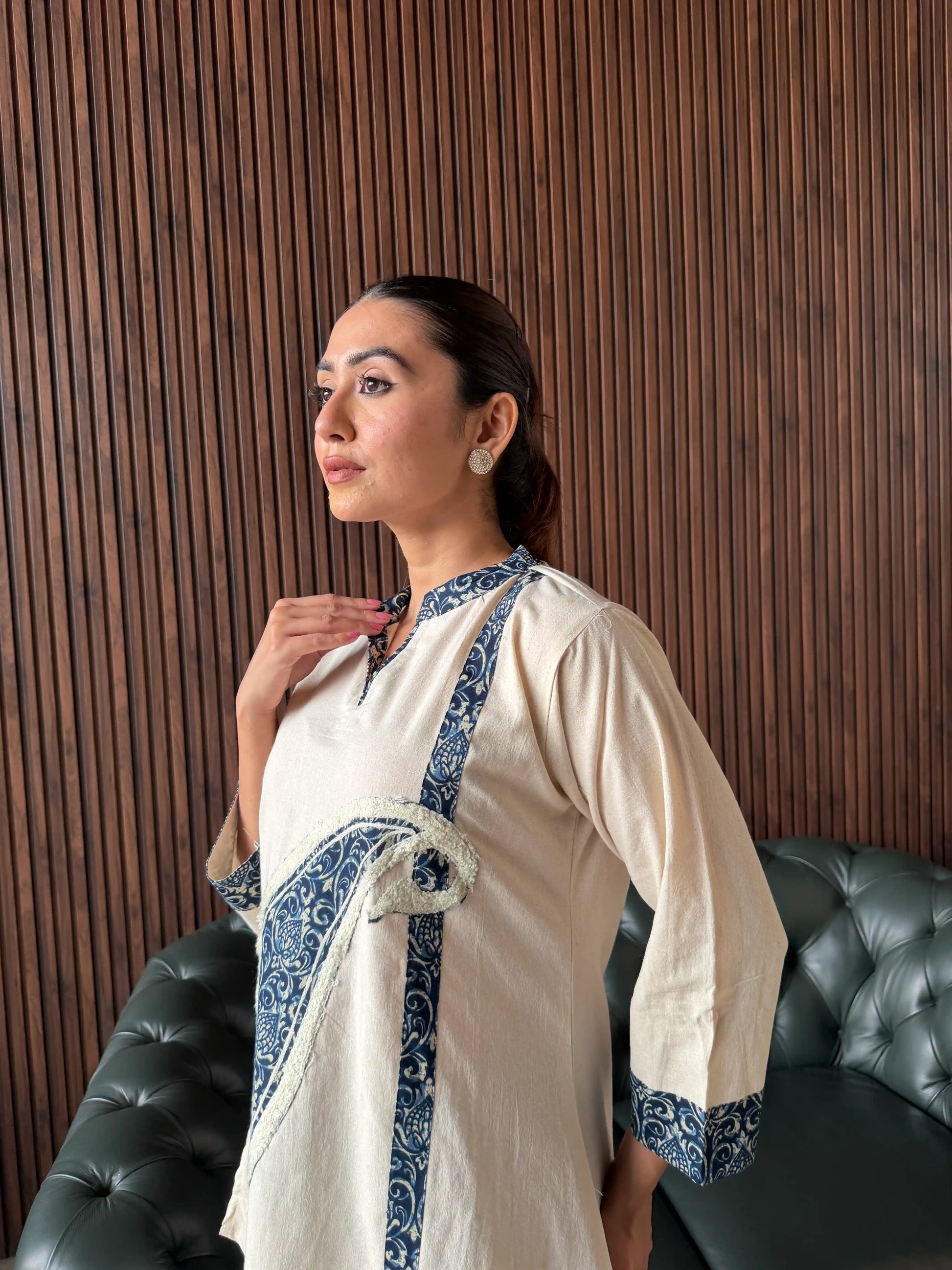 A smart olive green co-ord set featuring subtle embroidery on the kurta and matching tapered pants. Designed with a relaxed yet structured fit, this outfit offers a modern, minimal look—perfect for everyday wear or casual outings with a refined touch.