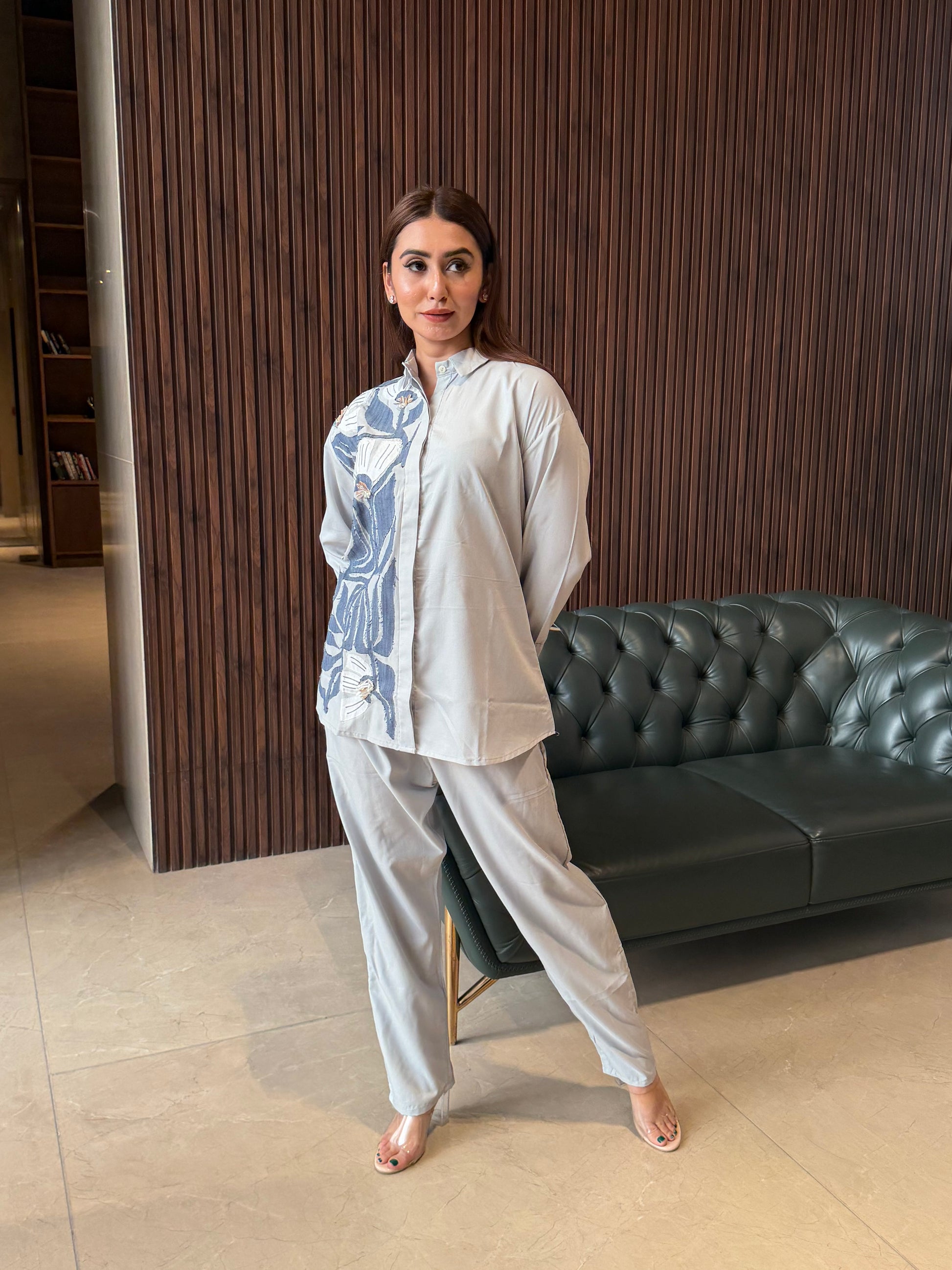 A cool-toned shirt and pants set featuring a striking blue botanical panel on soft grey fabric. Minimal, elegant, and effortlessly stylish for everyday wear or polished outings.