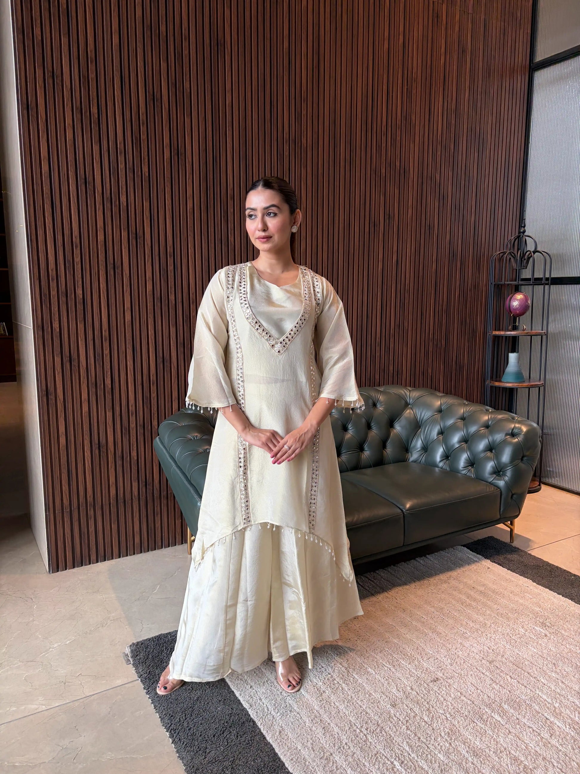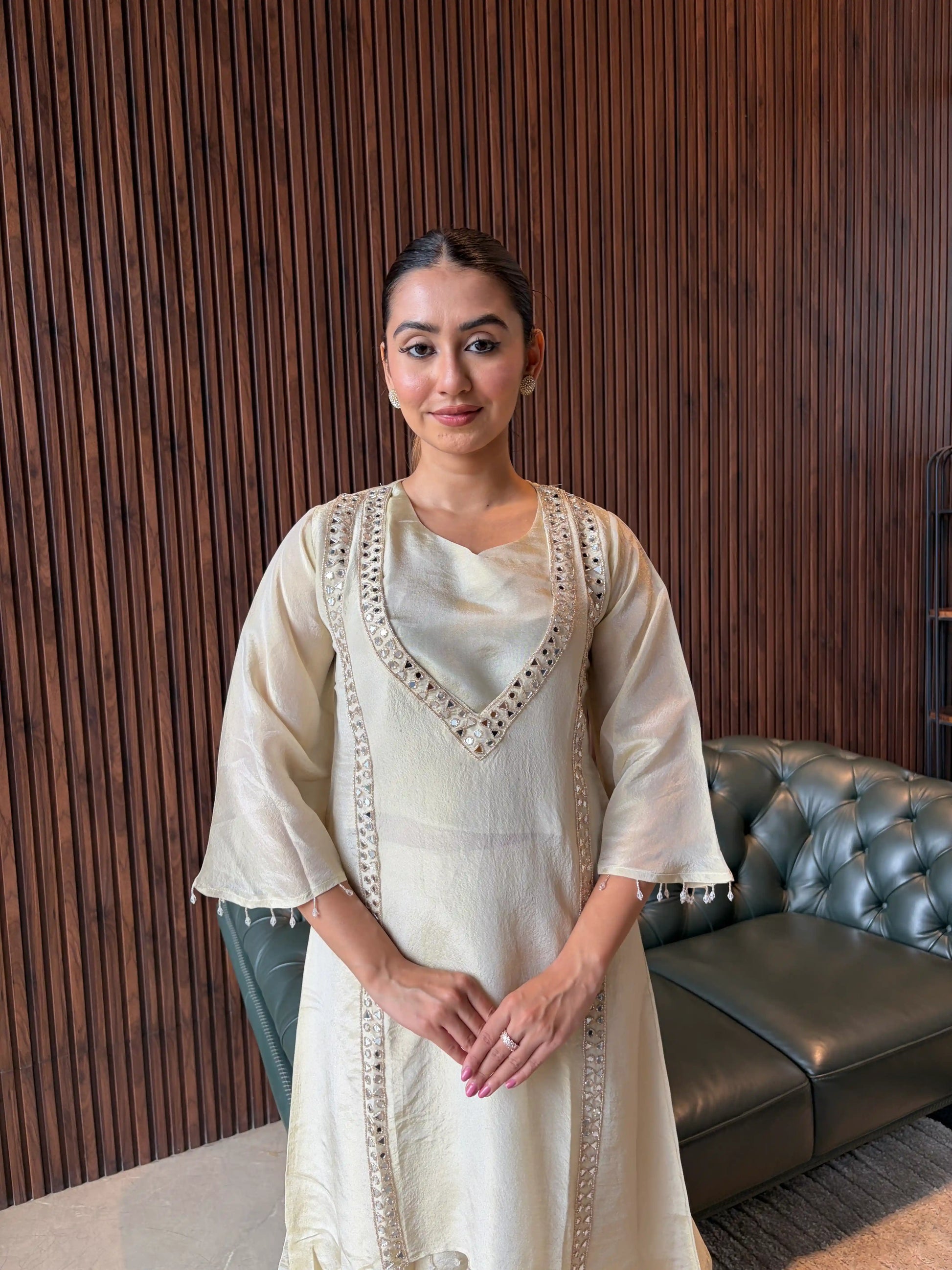 A smart olive green co-ord set featuring subtle embroidery on the kurta and matching tapered pants. Designed with a relaxed yet structured fit, this outfit offers a modern, minimal look—perfect for everyday wear or casual outings with a refined touch.