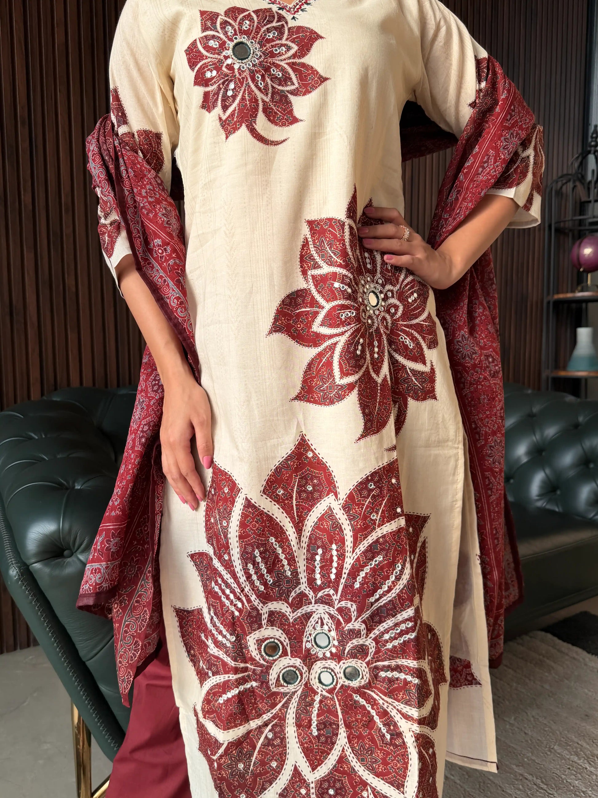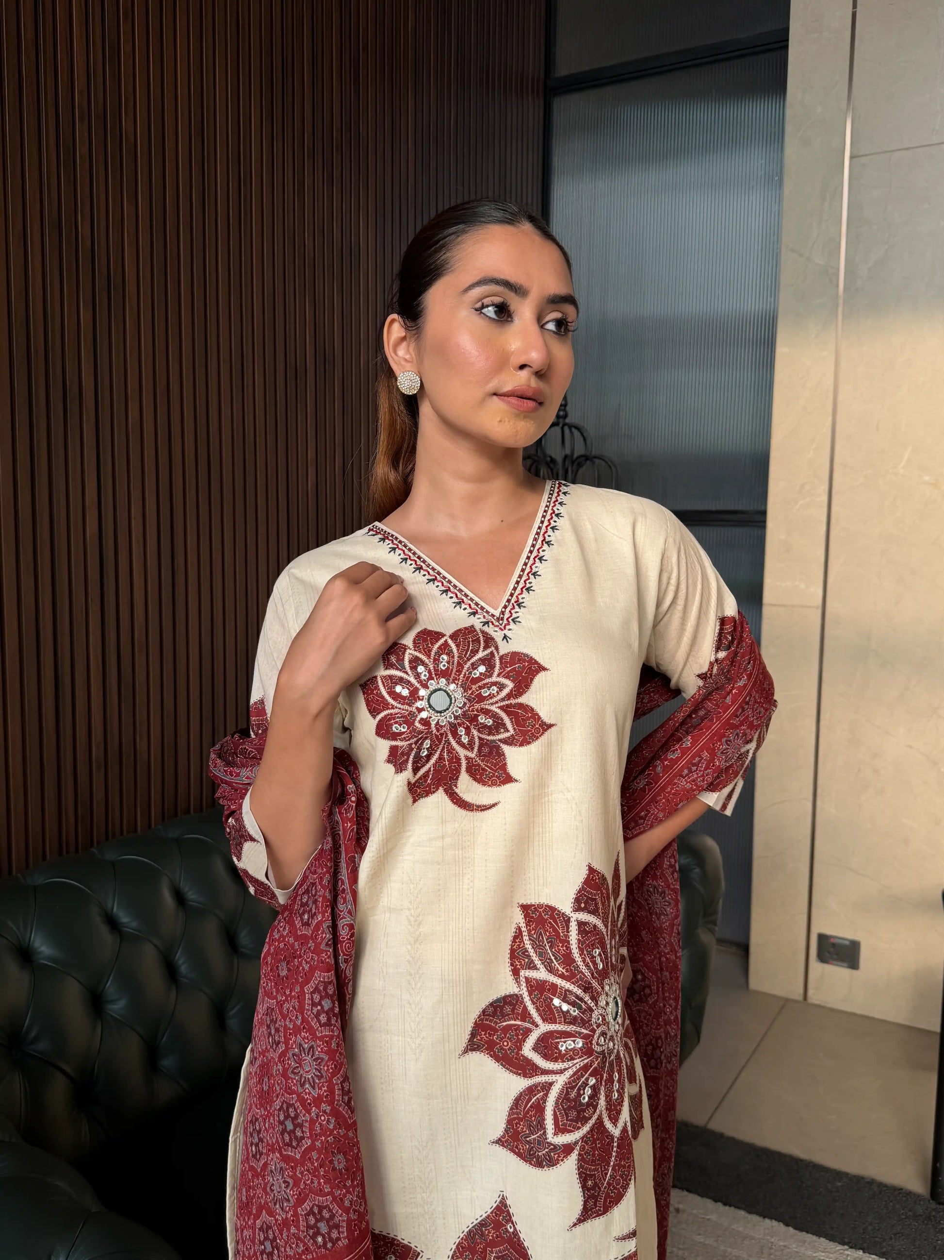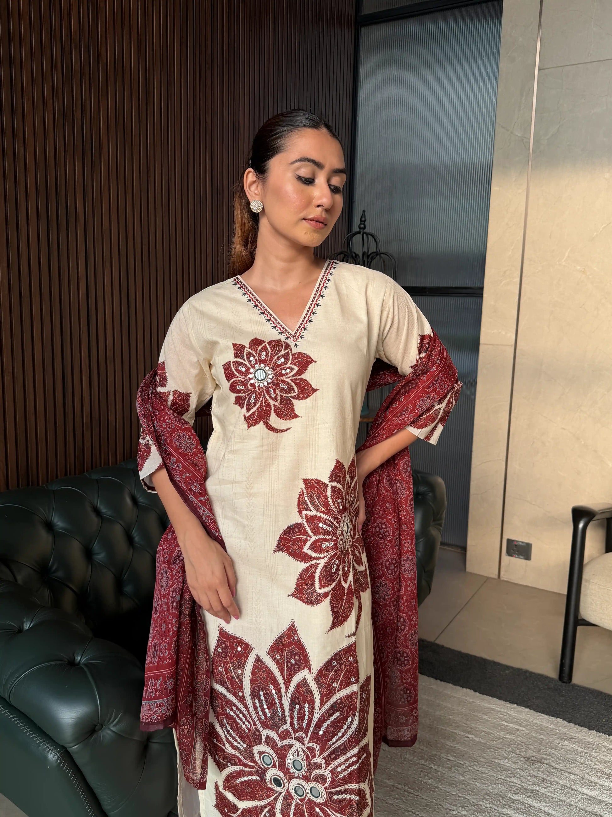 A smart olive green co-ord set featuring subtle embroidery on the kurta and matching tapered pants. Designed with a relaxed yet structured fit, this outfit offers a modern, minimal look—perfect for everyday wear or casual outings with a refined touch.