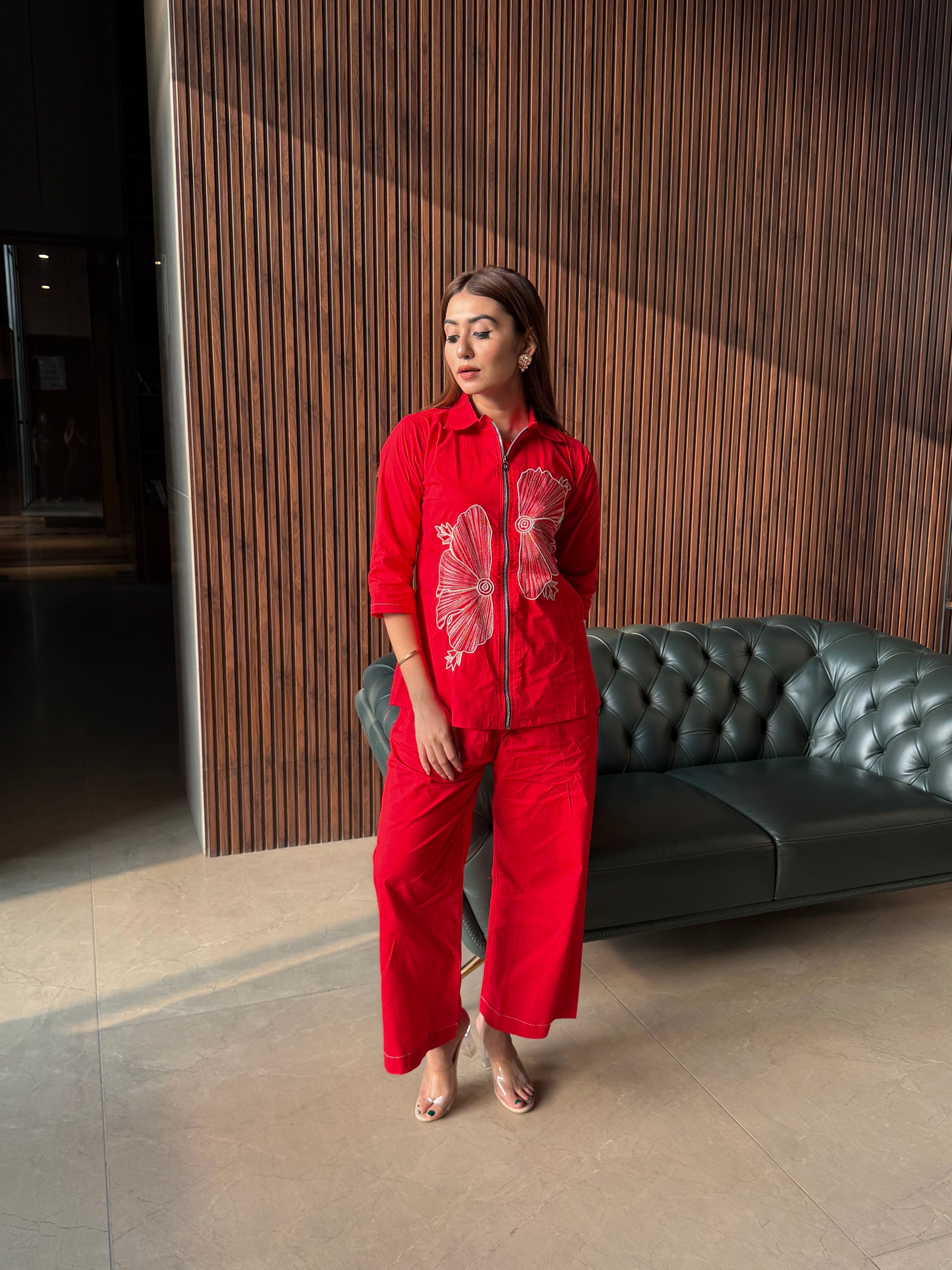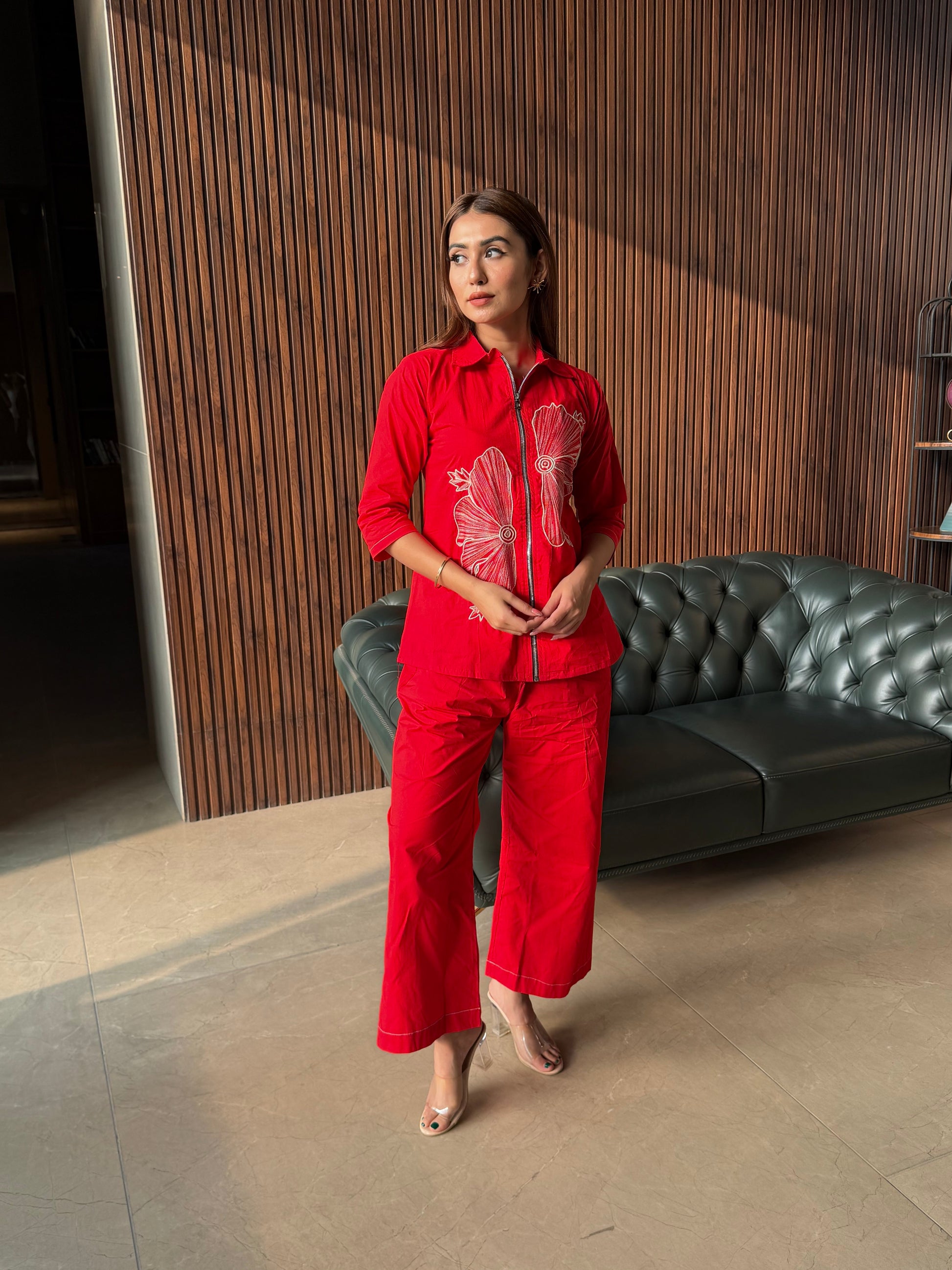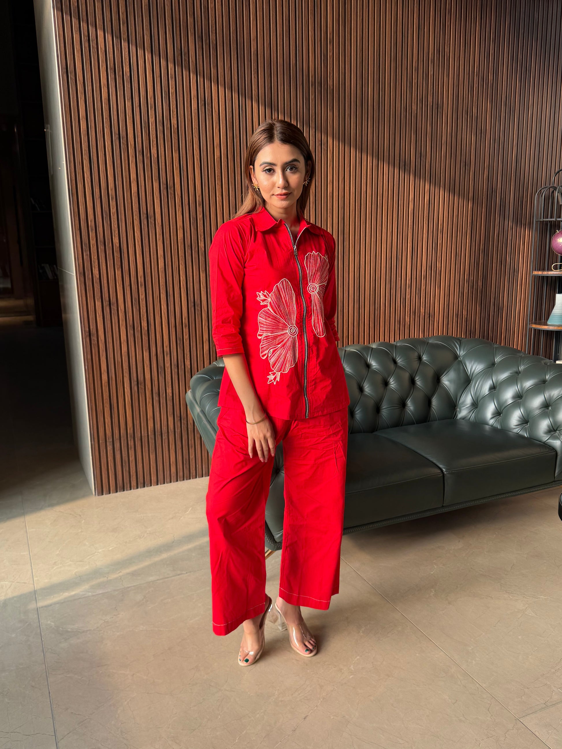 A bold and stylish red coord set featuring intricate floral embroidery and a modern front zipper. Soft, comfortable, and perfect for everyday elegance or casual outings.